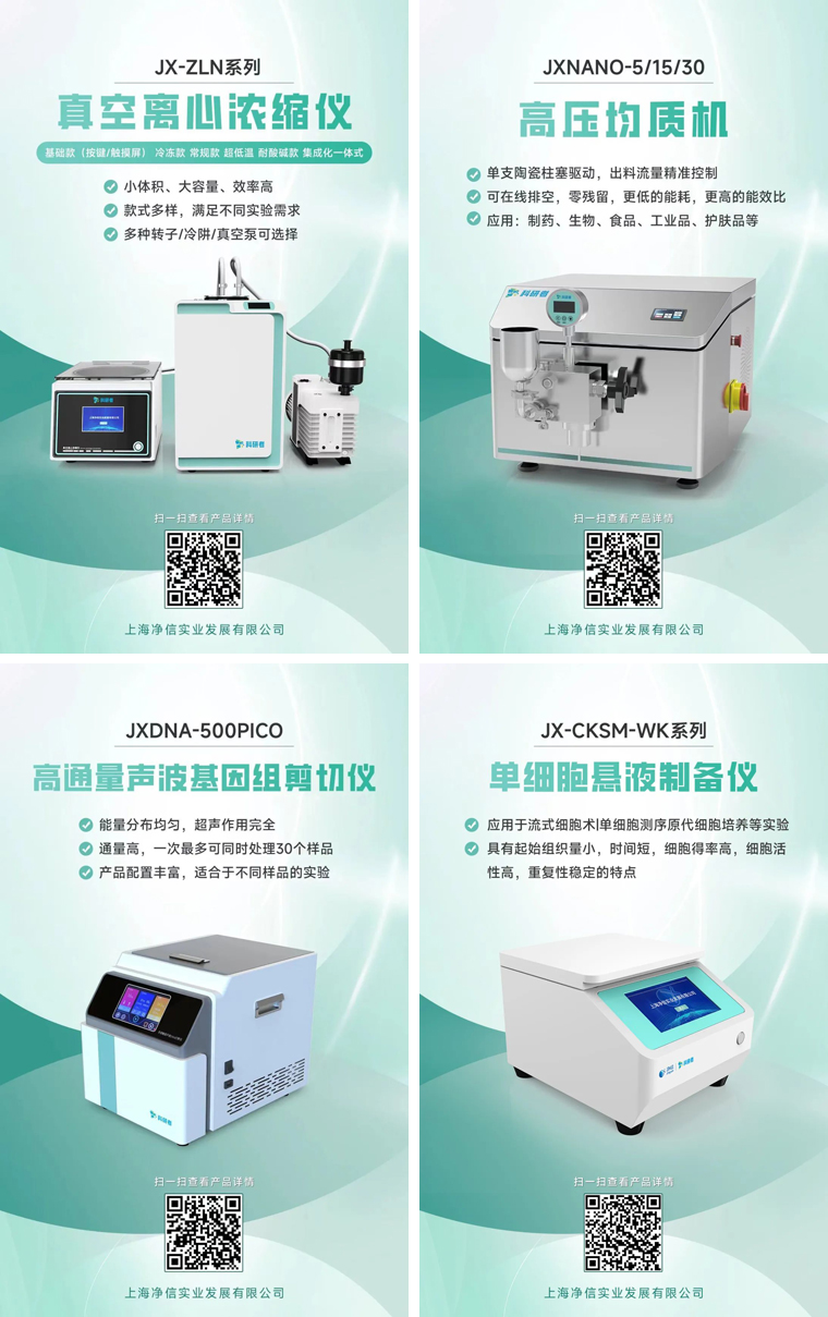 十幾年來凈信不斷進行自我創新與突破。通過持續優化產品性能和提升服務質量,我們實現了從單一產品到多元化發展的轉變,拓展了市場影響力。上海凈信科研者系列產品也在上市推廣中!真空離心濃縮儀、高壓均質機、單細胞懸液儀、高通量聲波基因組剪切儀。